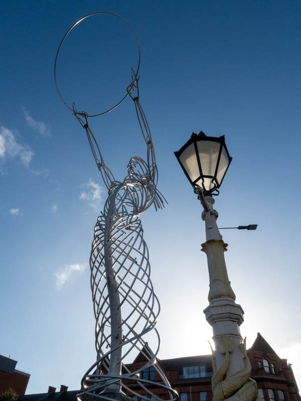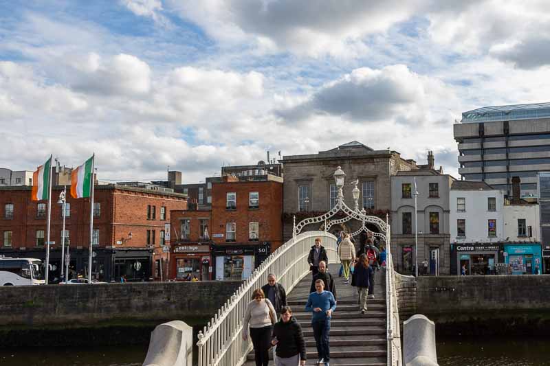 Ha’penny Bridge and the Famine Memorial along the banks of the river Liffey.