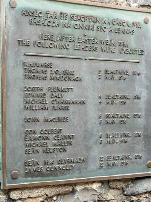 The plaque shows the names of the prisoners executed. The last name ‘James Connolly’ was badly injured and held in the Dublin Castle Hospital to keep him alive so he could be executed.