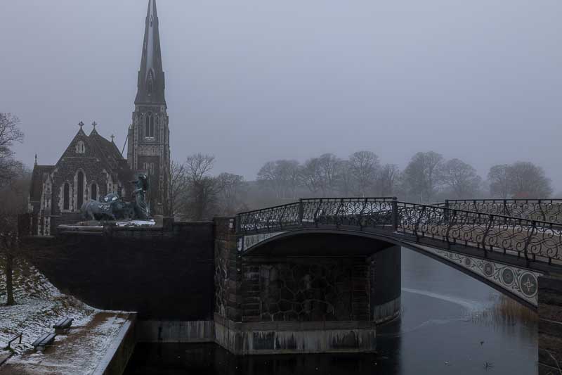 Soon it would be dark, so we headed back to the hotel for another layer of clothing before heading out for some night photography. But first this image of the St Alban’s Church with the Gefion Fountain in front of it.