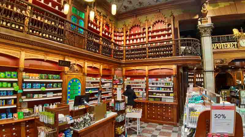 Notice the ice in the harbour inlet; it was approximately 5cm thick. The sky remained overcast all day but as mentioned earlier, it was mostly dry. When we stepped into the Apoteket Lejonet (chemist) it felt as though we had gone back in time.