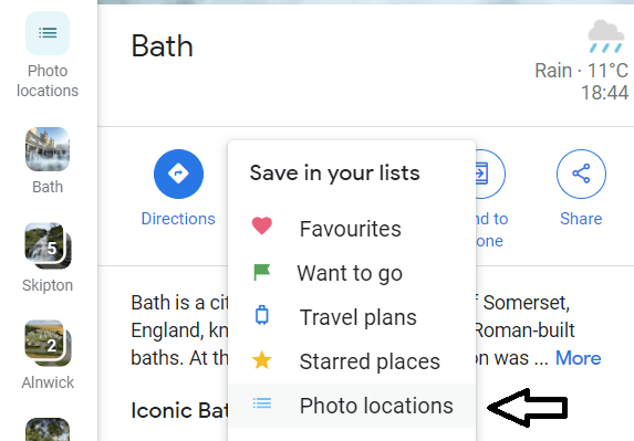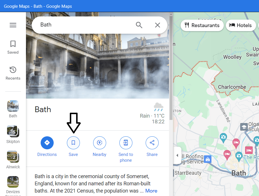 As an example, if we use Bath as a generic search, then Google shows several options – the second one being “Save”. Selecting this you’ll be presented with several folders in which you want to save a bookmark.