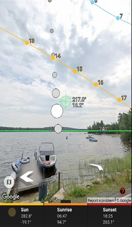 The next example used live view; the left hand image was captured on my phone adjacent to a pier on Little Sunapee Lake in New Hampshire whilst checking out the best photo location (needs a mobile data connection). I had previously used the Ephemeris part of Sun Surveyor and the ‘Map’ view to identify this as a possible Milky Way location in New Hampshire before we arrived in the USA. The right hand image shows the result of this research.