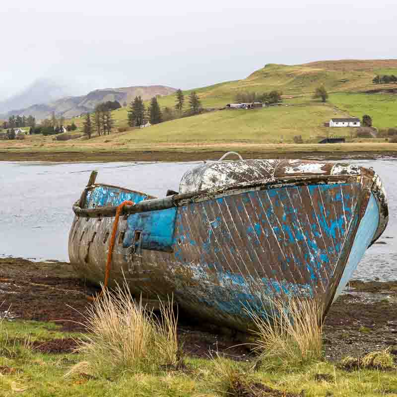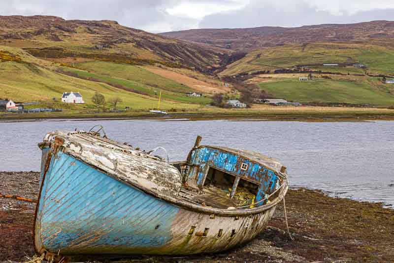 17th April – Blue Skies in Scotland – how rare.: The intention was to get up early for the 50 minute drive to Elgol, but when I got up at 5:30am it was raining again, so no need to drag Vanessa out of bed. We eventually left the motorhome just after 8am for the 30 mile journey around the Cullin Hills. We arrived at what should be a spectacular location, but it was still very overcast, but we set off carrying the dog over the large rocks to get to the shoreline facing the Cullin Hills.